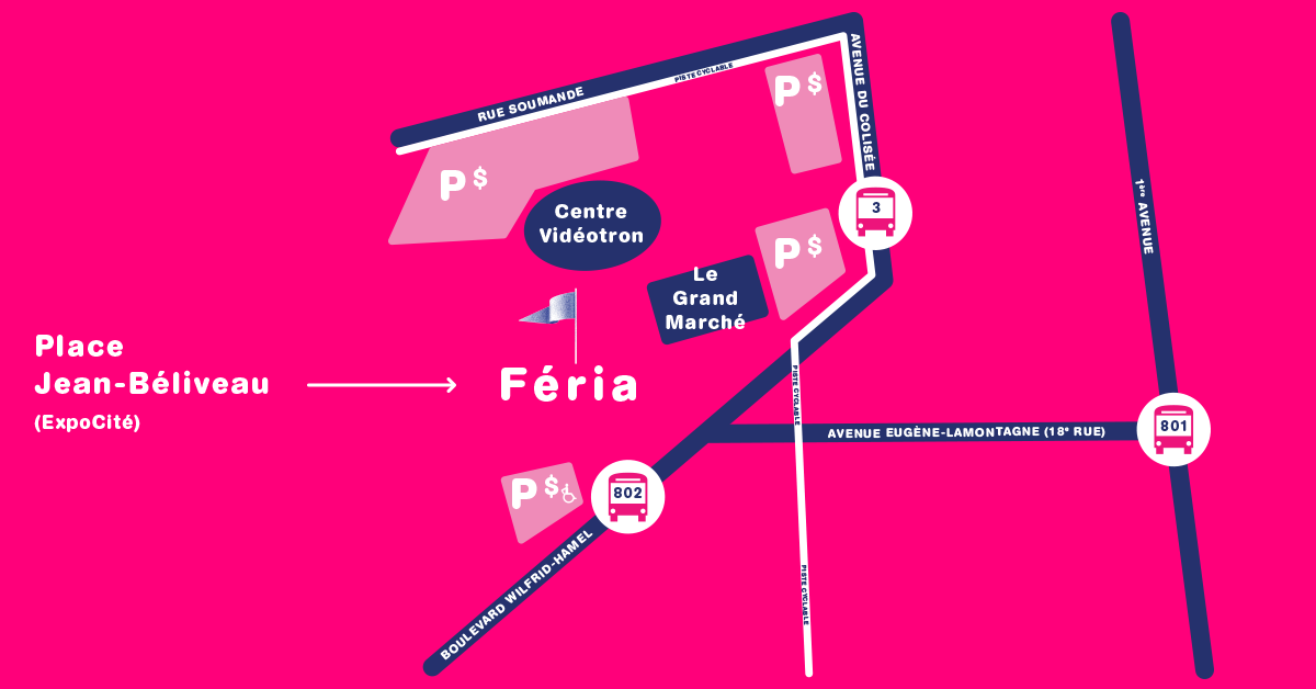 La place Jean-Béliveau est située sur le site d’Expocité, près du Grand Marché et du centre Vidéotron. Le site est facilement accessible en autobus via les parcours 3, 801 et 802, en vélo ou encore en voiture.